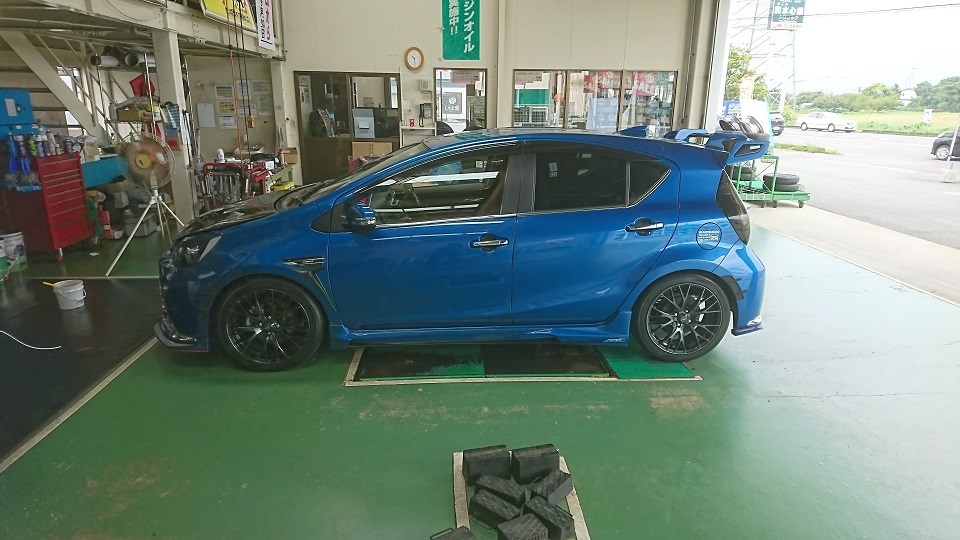 アクア 車高調取り付け 四輪アライメント調整 カー用品持込取り付け専門店 フラットフィールド 四輪アライメント サスペンション交換
